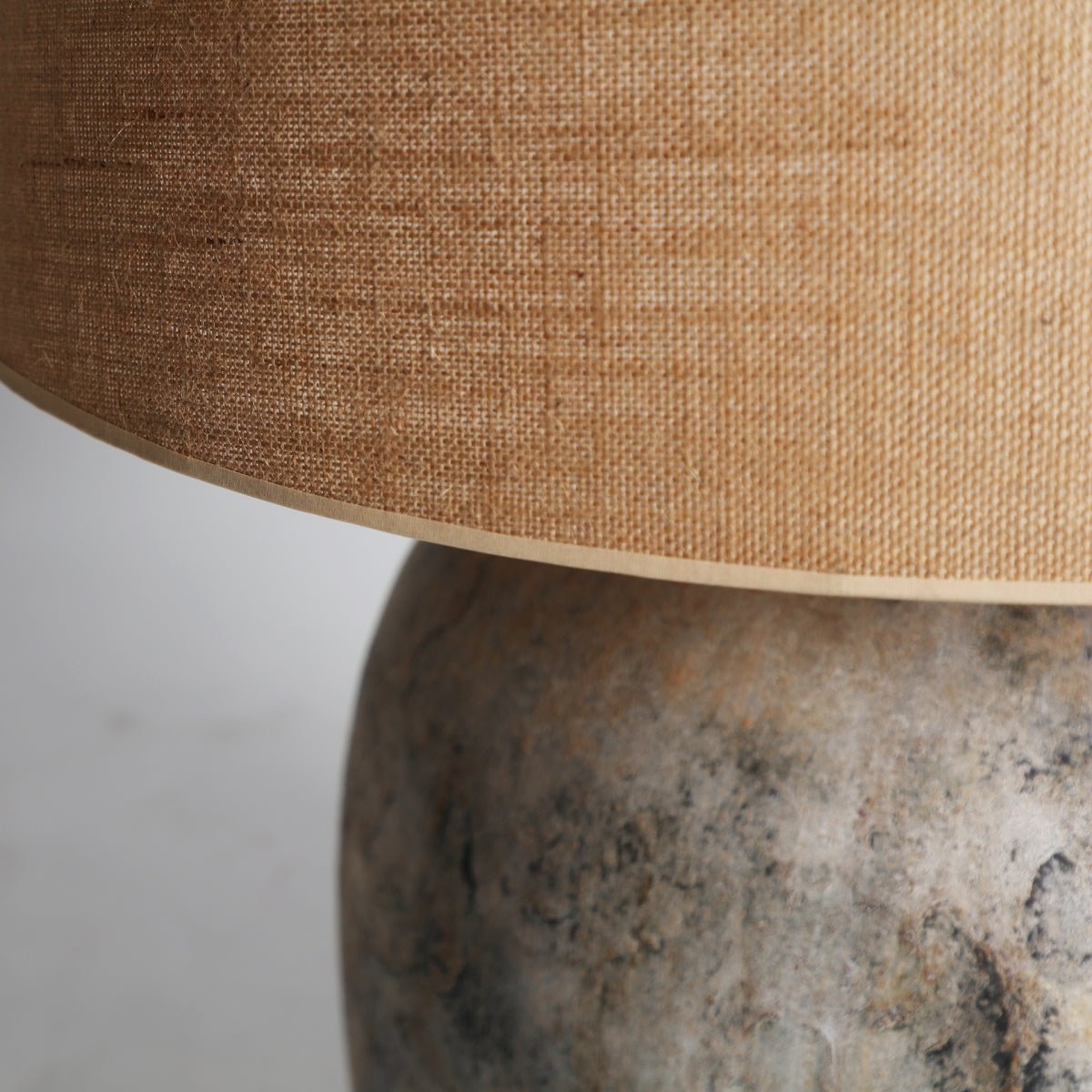 Bordlampe, grå farve, stil provenzal. Fremstillet af beton, kombineret med jute. Produkt aftageligt.