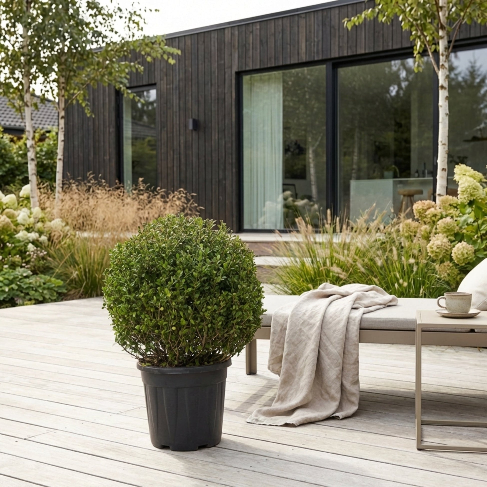 Japansk kristtorn (Ilex crenata) i kugleform er en kompakt og stedsegrøn busk, der er ideel til krukker, indgange og dekorative beplantninger. Planten har en naturligt tæt og rund vækst med små, blanke mørkegrønne blade, som bevarer deres farve året rundt.