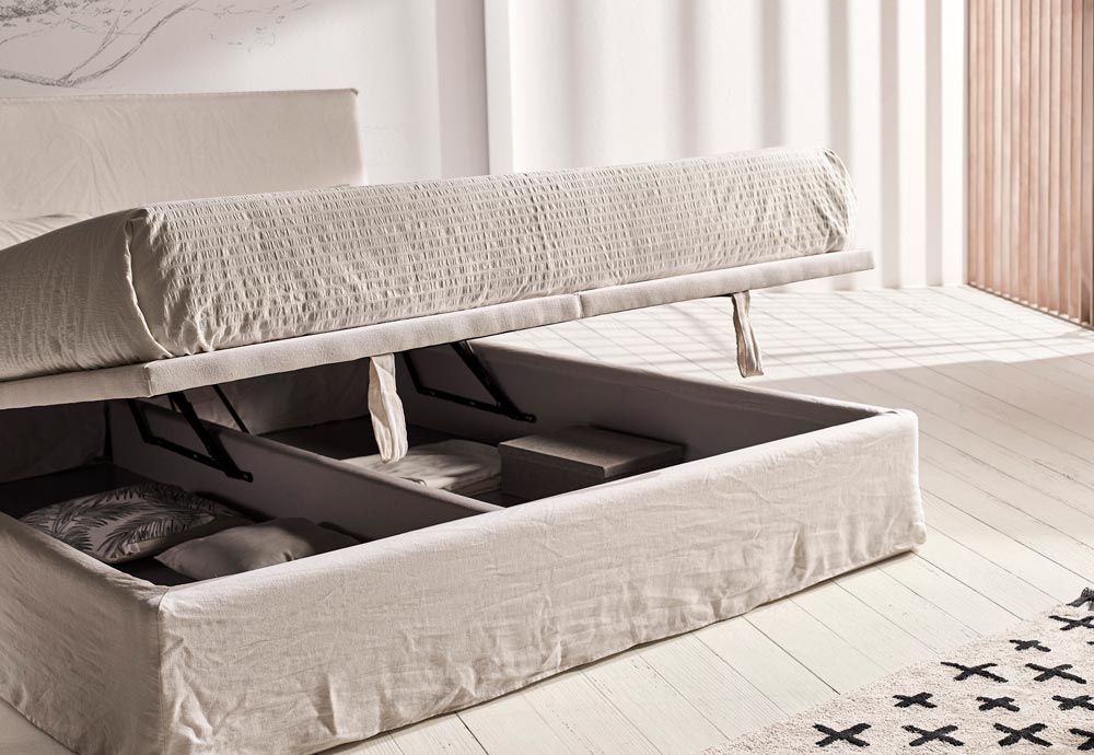 Sengensbund kan enkelt løftes op så man kan have opbevaring under. Materialet er udført i 100% linen.
