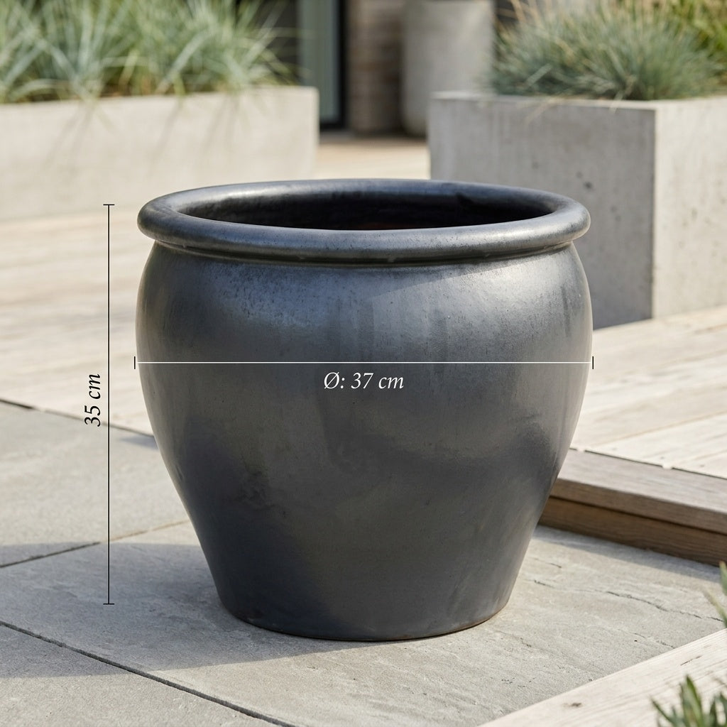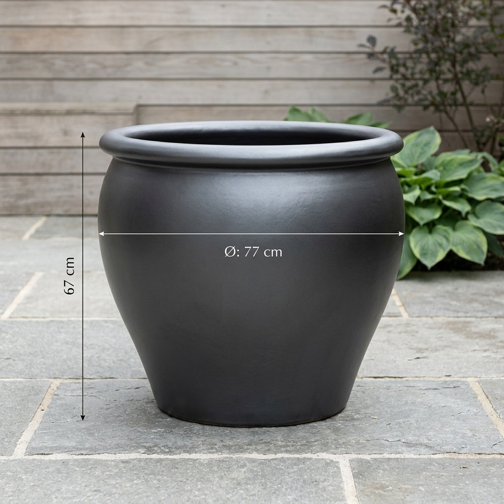 Krukkens organiske form og chancerende glasur i den grafiske sorte Graphite nuance giver et stilrent grafisk udtryk der står i elegant kontrast til naturens farver. Perfekt til at skabe ro, struktur og rene linier i haveopgang, på teressen eller i havens hjørner. Potten er også perfekt inde i stuen, entré mm. hvor den kræver underskål idet krukken har naturlige huller i bunden for at undgå overvanding af rødder.